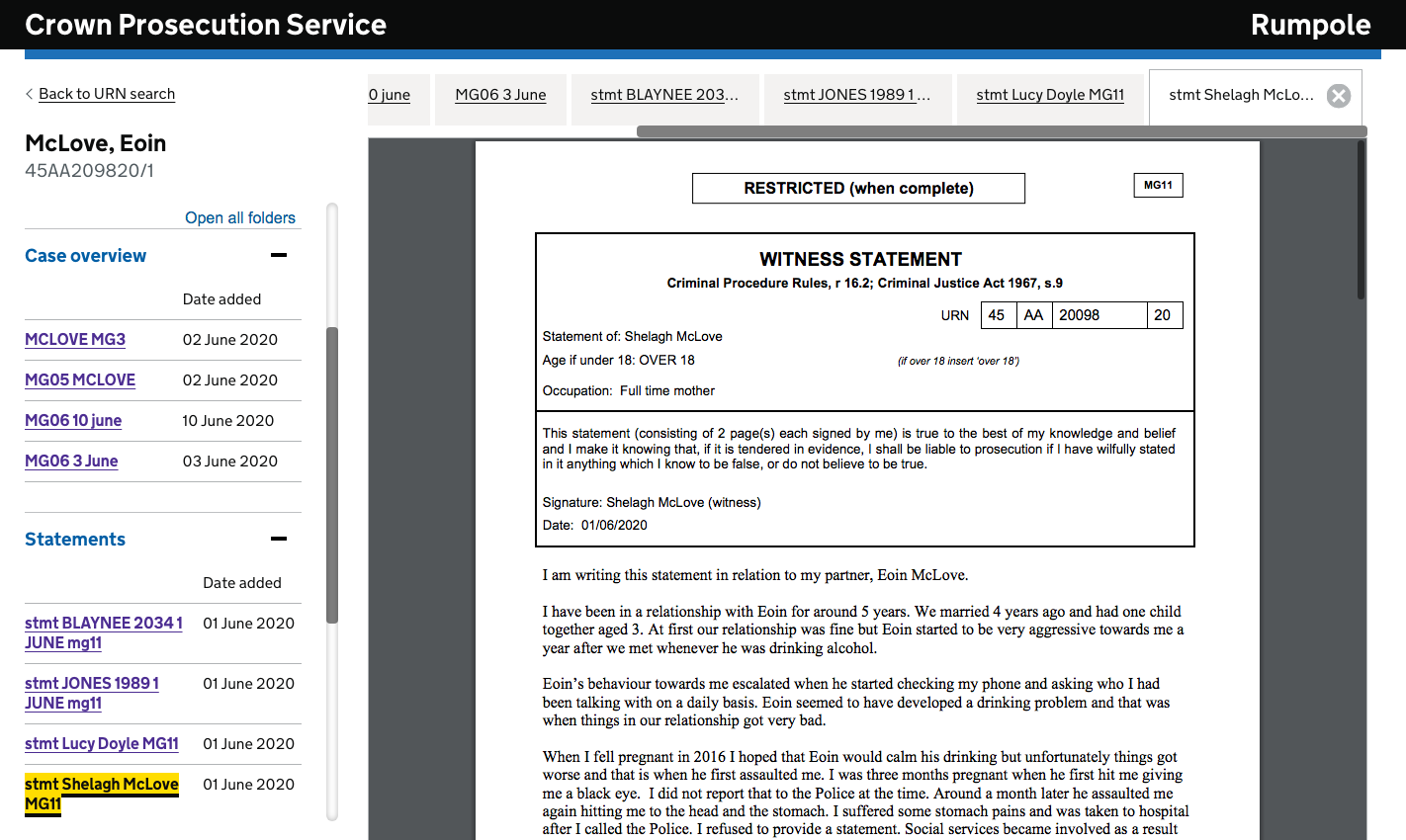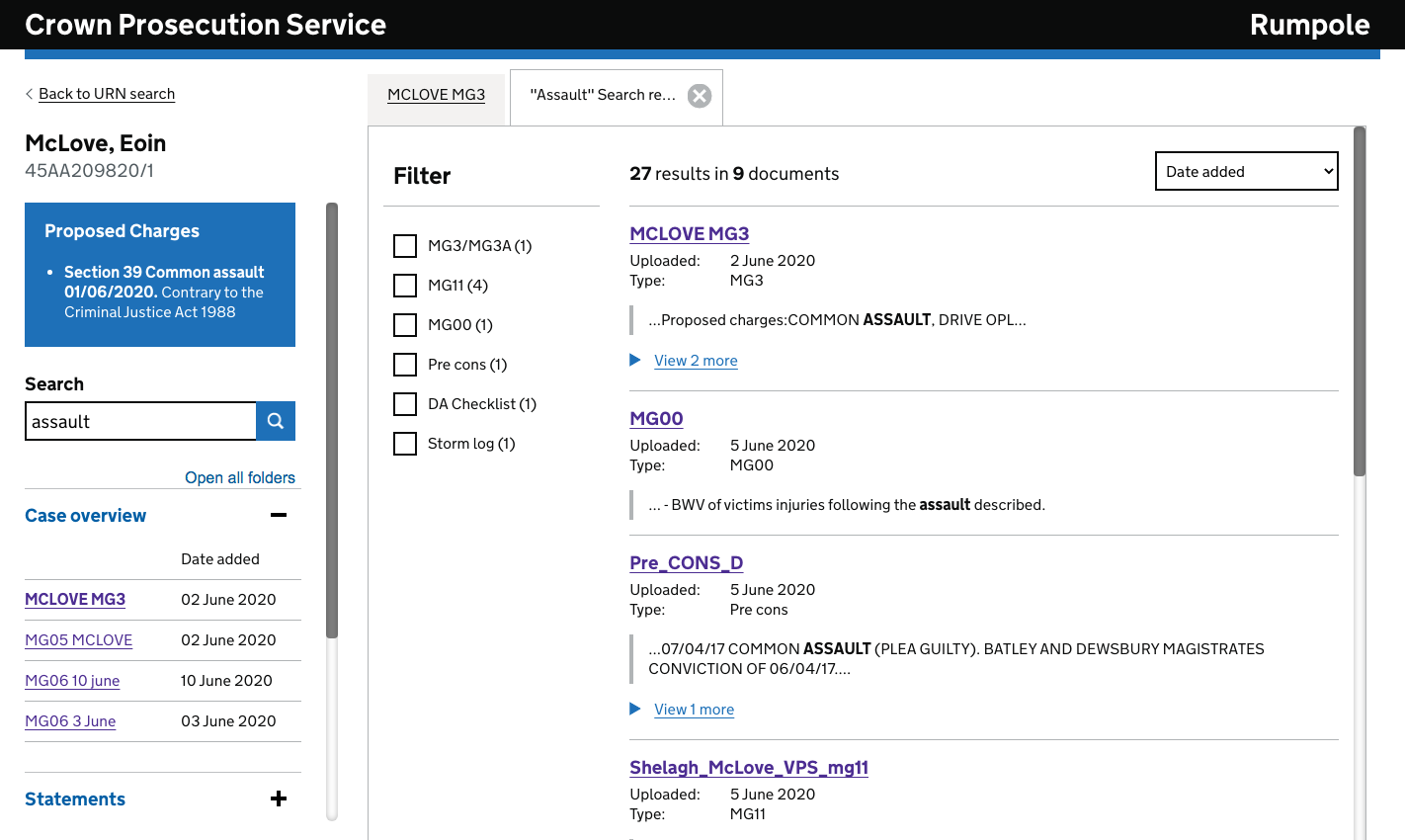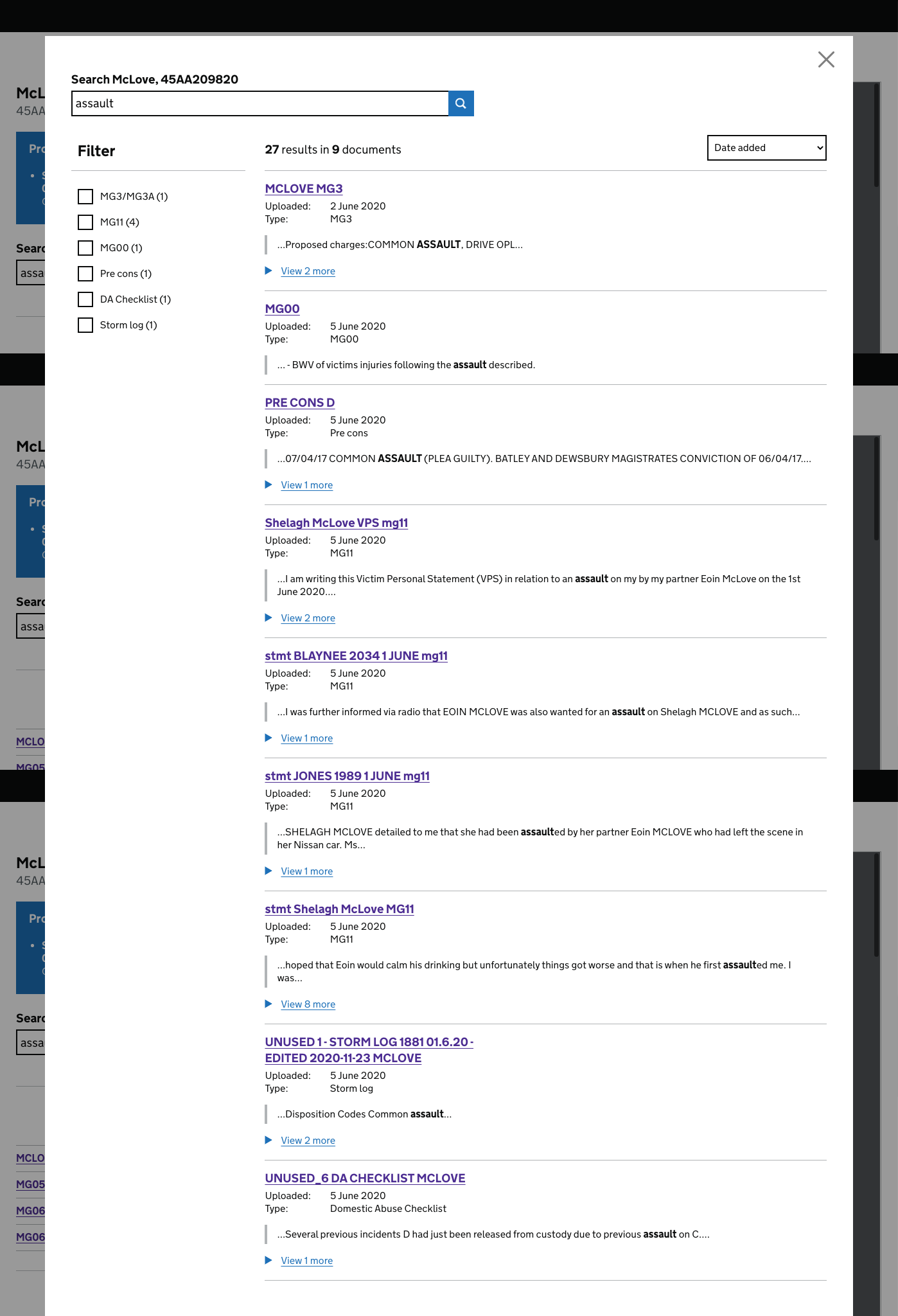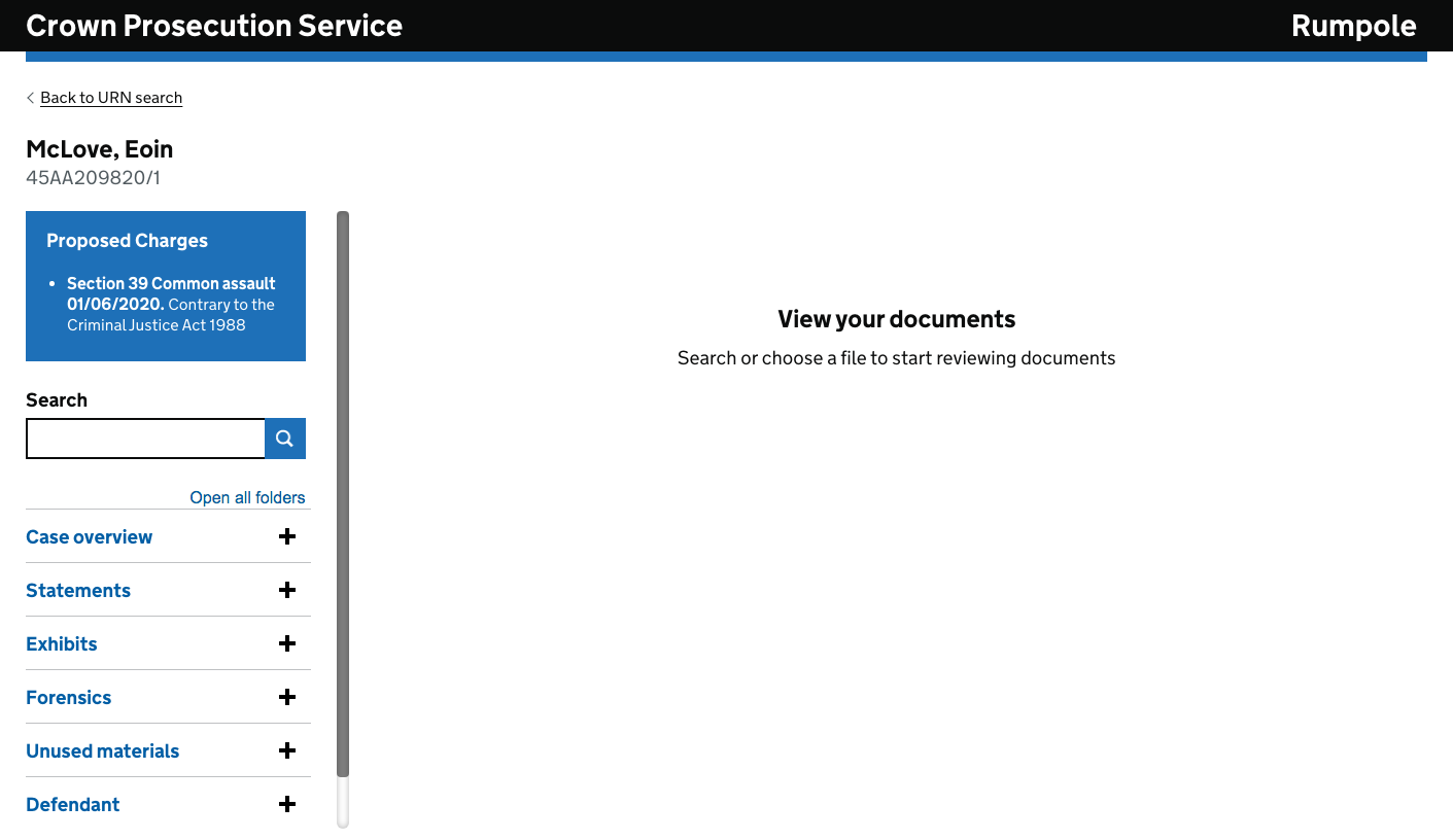 This is the second draft of a journey that starts with searching for a case file URN, allows users to find that case and open all the documents related to that case in a case viewer.