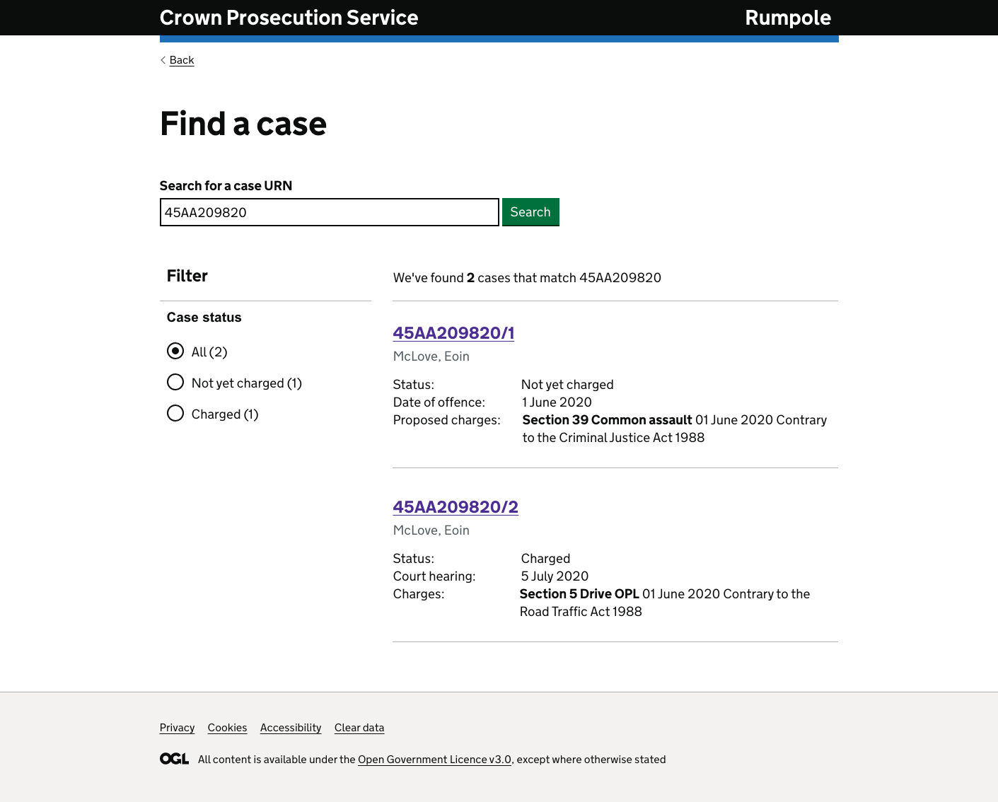 works well. Needs addional status in filter for finalised. Users also want date of offence on the charged results. Also new info about data means we need to accomodate multiple names, offences and a to and from date