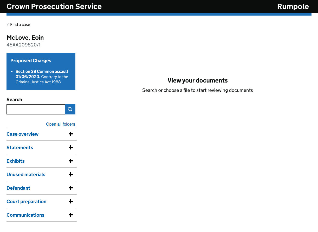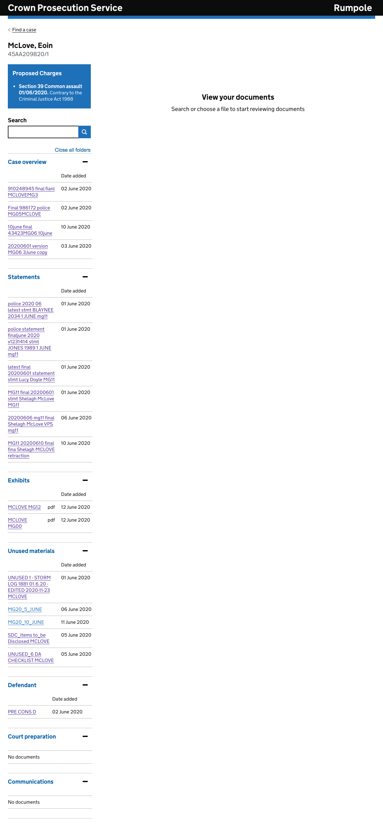- The charges and the case files are listed in the accordions on the left hand side. When the user clicks an accordion it opens to reveal the case files within.