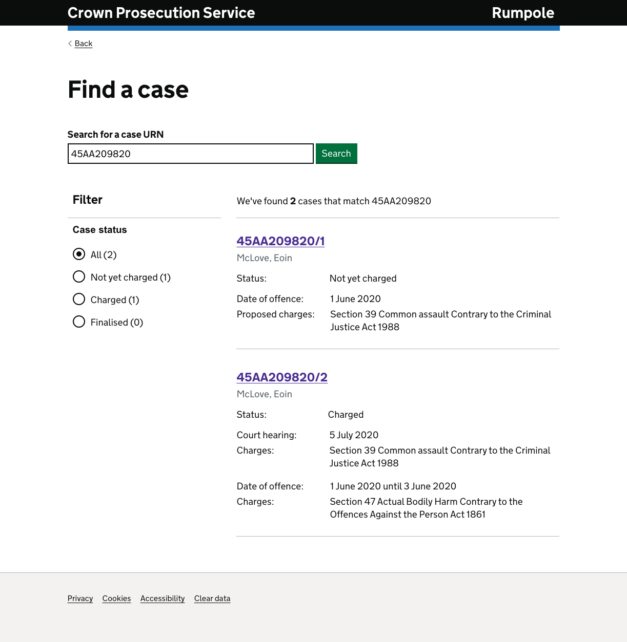 - Results of a case URN search. The only results will be an exact match to the URN. Cases can be split so there maybe multiple results.