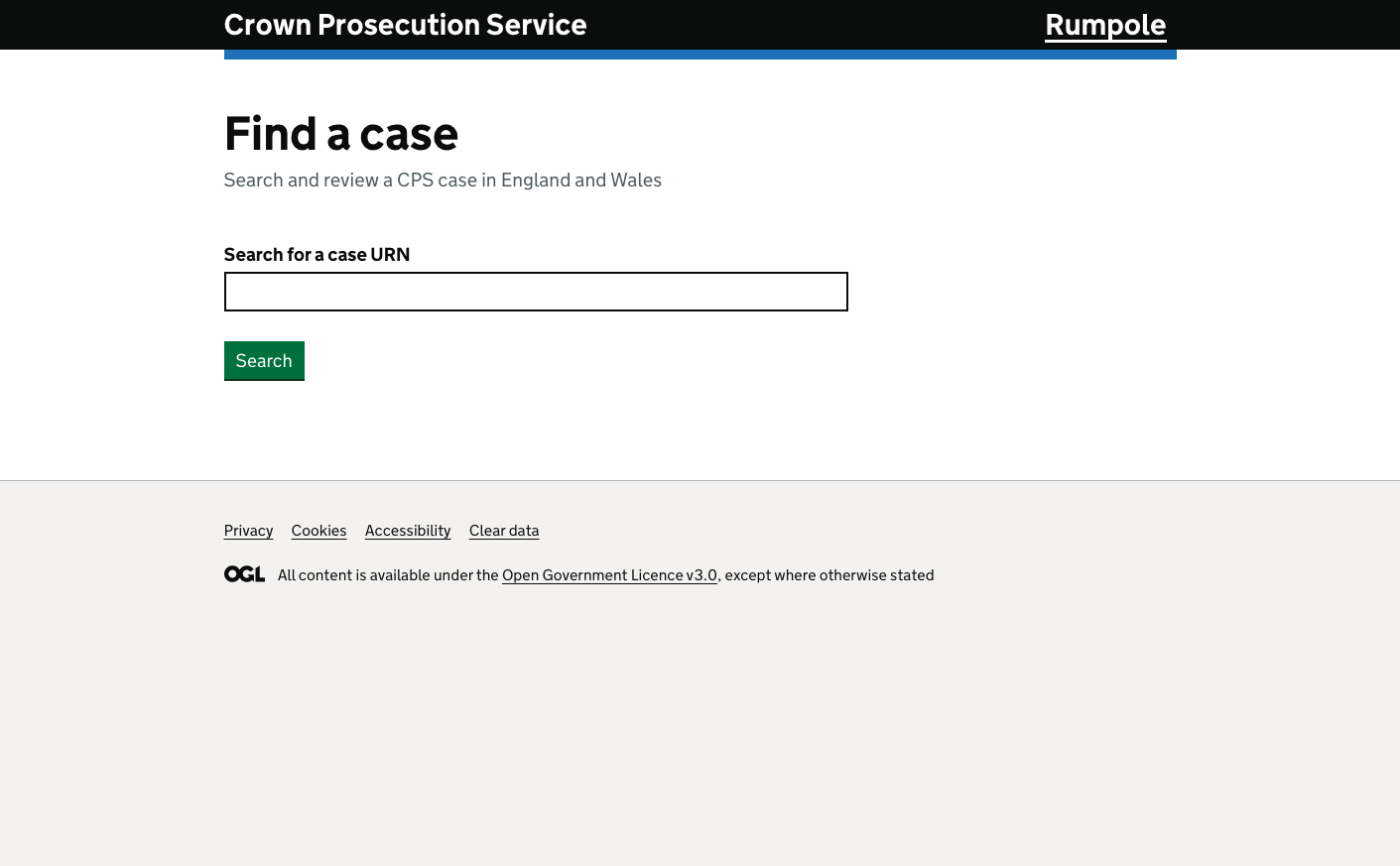 The start page. Users can only search by case URN in the first version. At some point in the future they will be able to search using other criteria (such as names or dates).