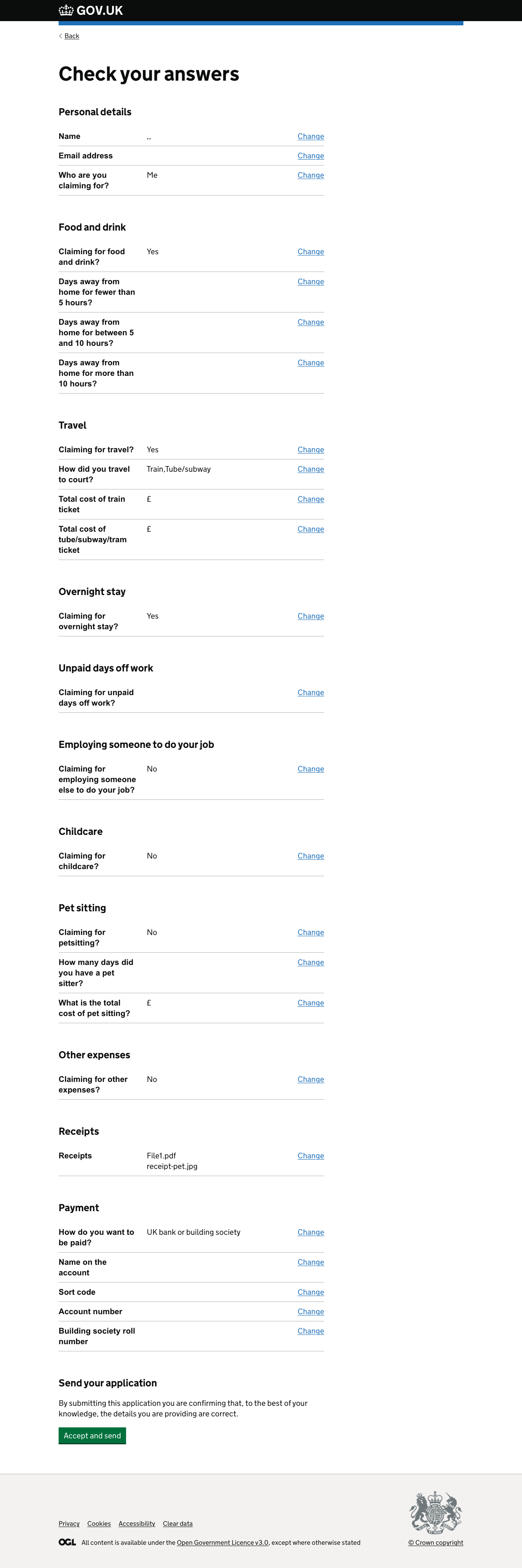 Users can claim for pet sitting if they had to get someone to look after their pets while they were in court. This is not pulled out as a specific category in the current blue form but has the highest volume of claims in the ‘other expenses’ section.