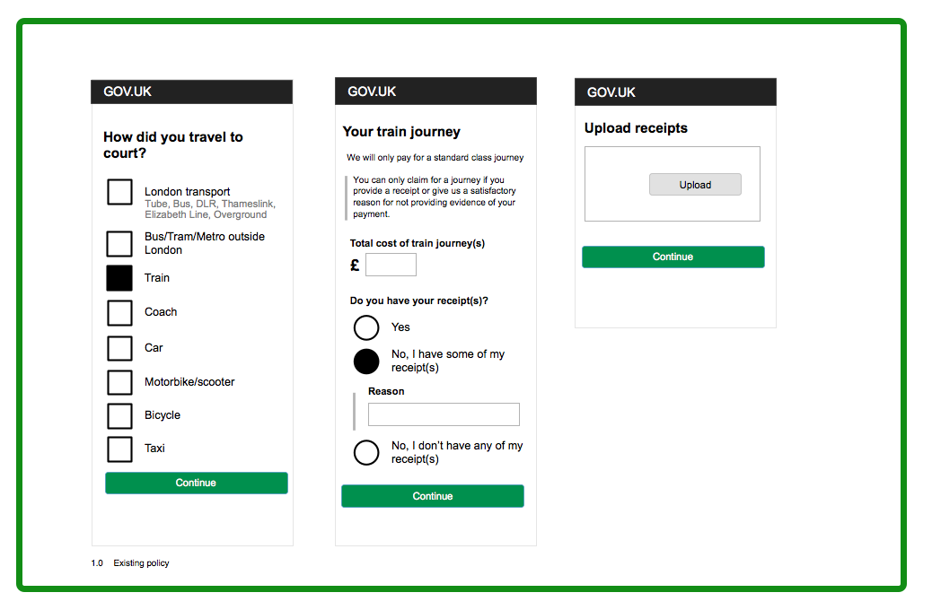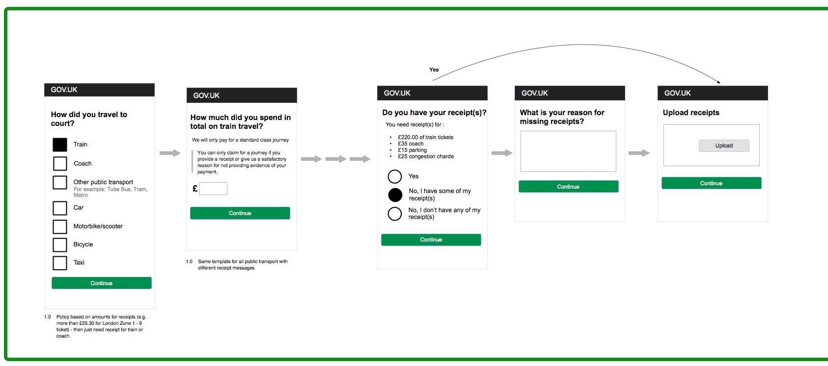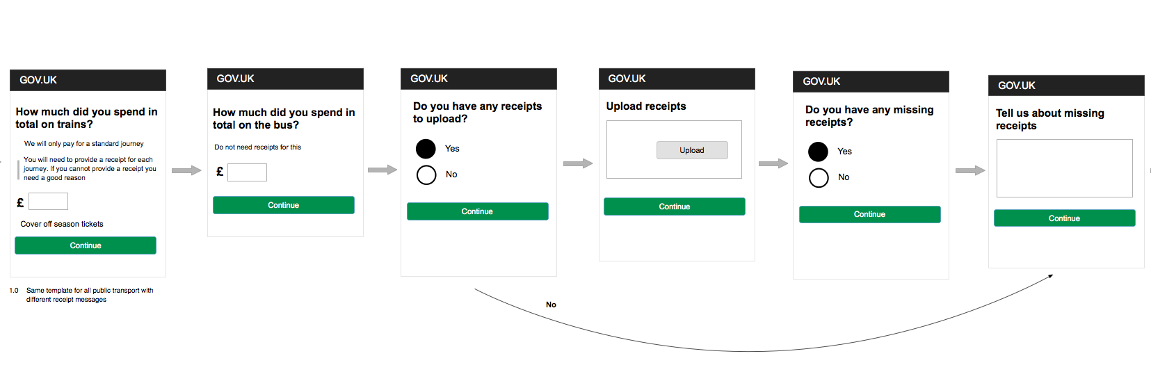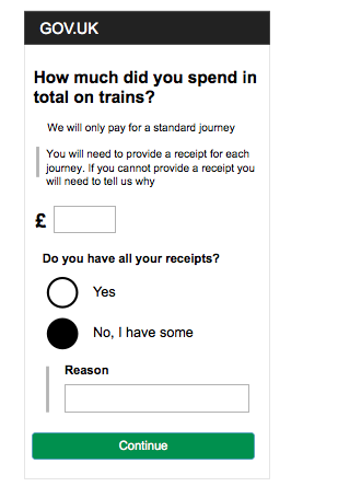 First sketch of asking for amount and reason for not having it on one page. At first i thought it breaks one thing per page but it is asking about your train tickets which is one thing. Is an early version and changed later so this version was not tested.
