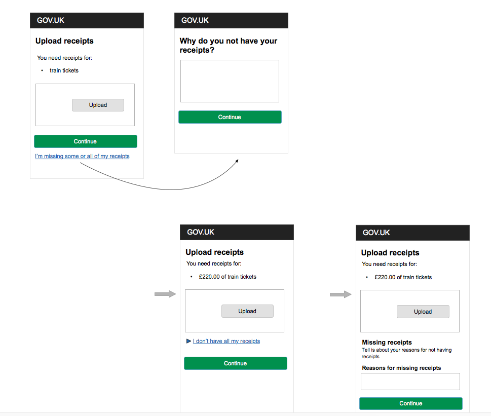 This version works by simply asking if the user has missing receipts on the upload screen. We did not test this as we did not think it clear enough. All users would have to see the upload page even if they did not have any receipts, then they would have to either scroll or read content on this page to see what to do. By putting a link on here, we would effectively be asking the user a question about whether they had their receipts or not, would rather break that question out and make it more obvious and clearer.