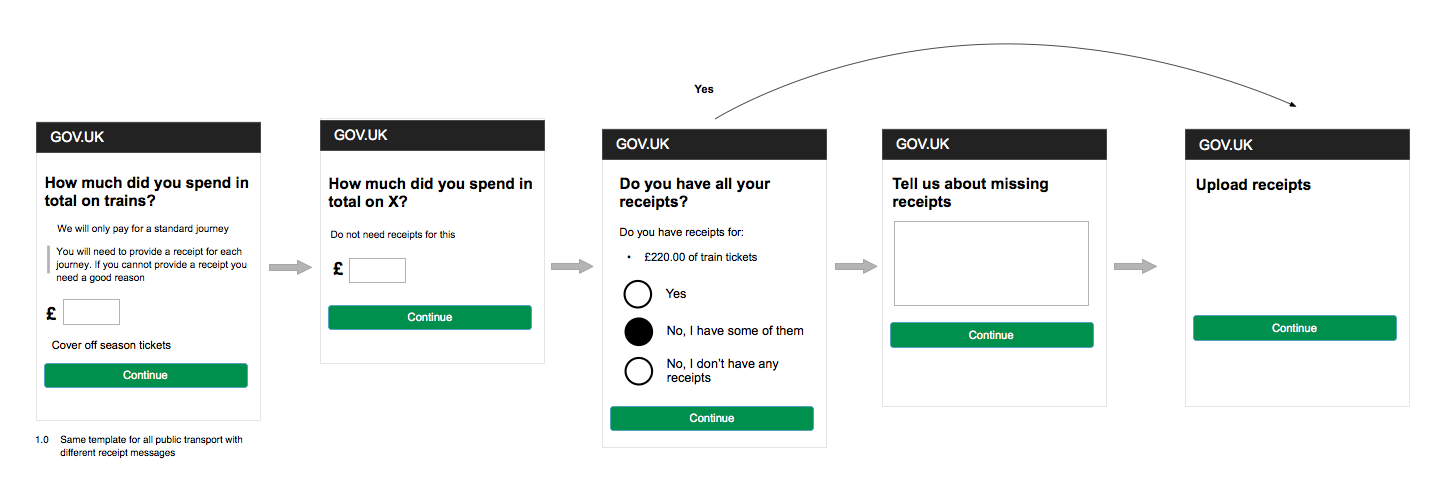 This was to test putting the questions at the end and breaking them up into separate questions. Wasn’t sure about asking about missing receipts after the user has uploaded as this could be confusing.