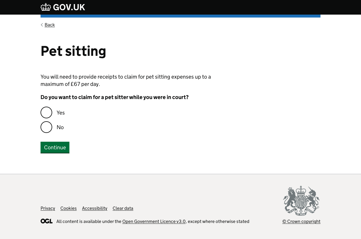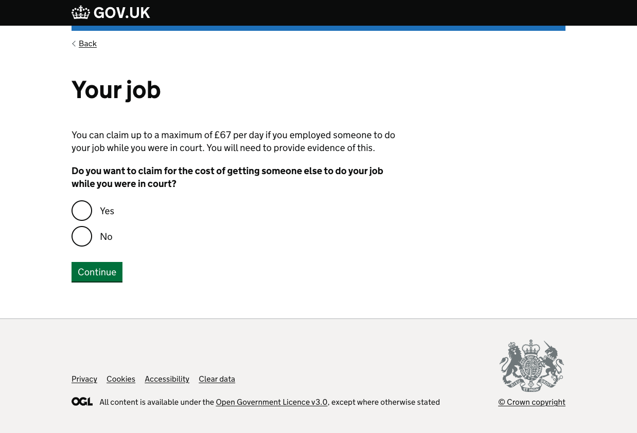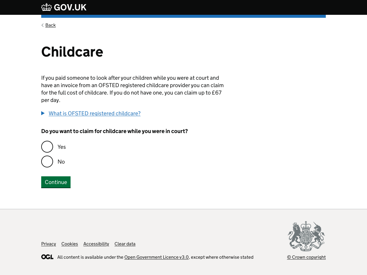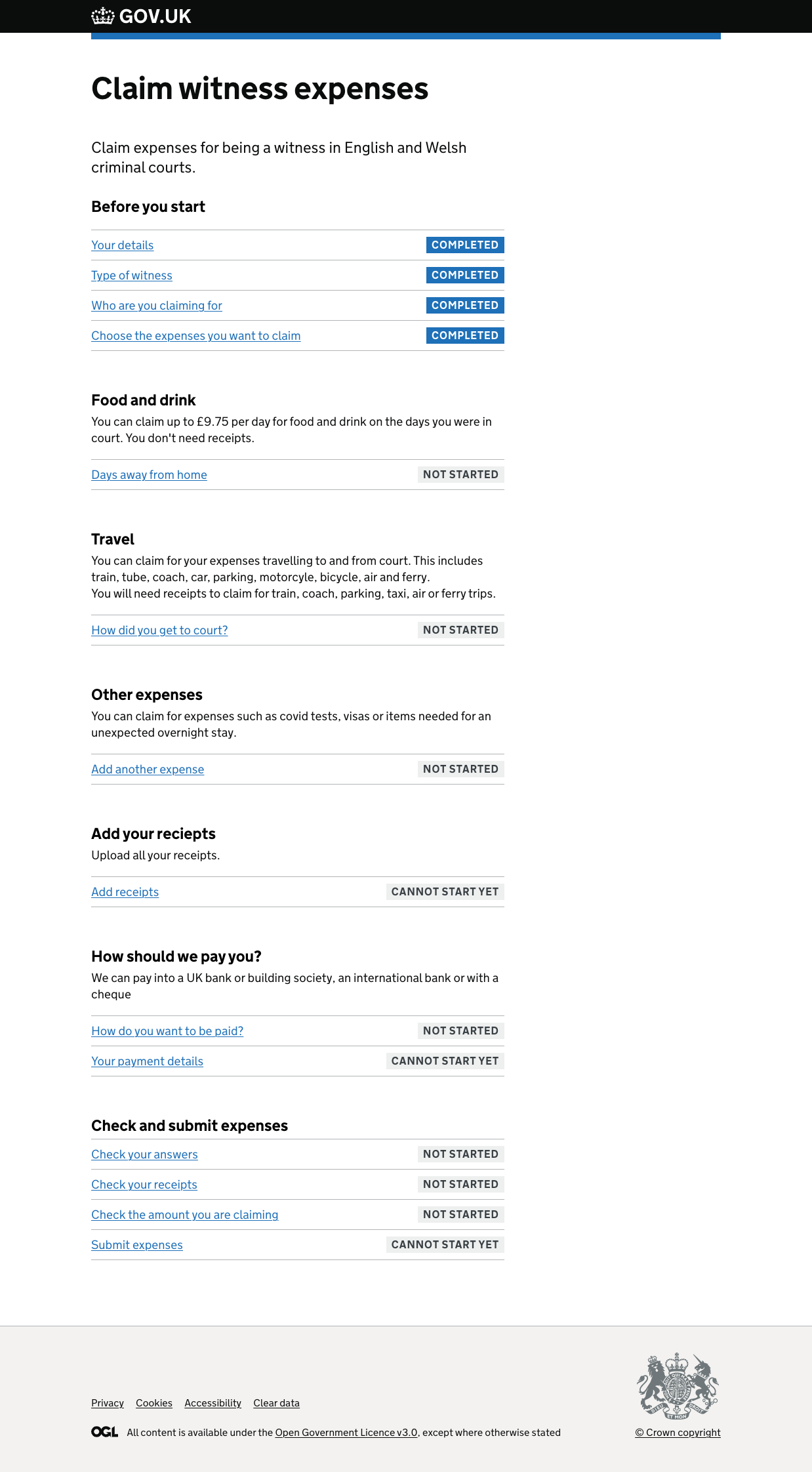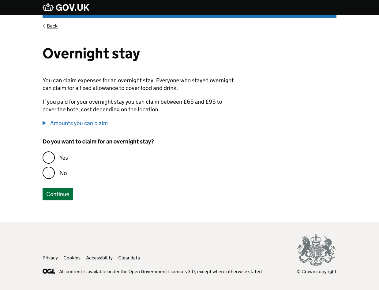 This task list updated to only show the criteria that everyone had to fill out (e.g. food) or the areas that users had said yes to earlier. This meant that users didn’t see areas that they didn’t want to claim for and had been primed with more info about how much they could claim and what they needed.